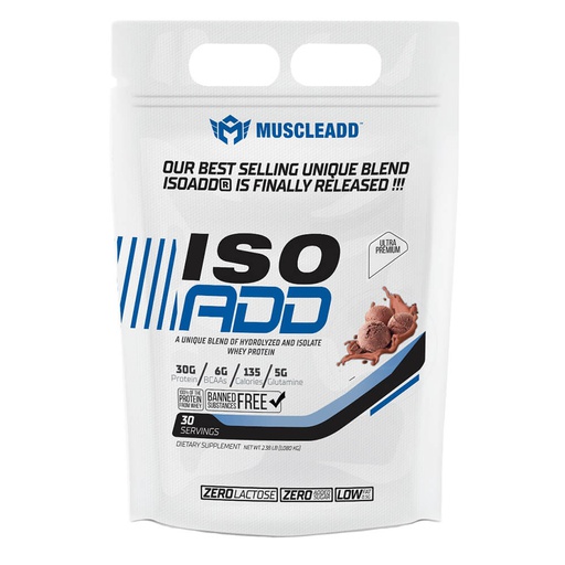 It is a whey protein blend that consists of whey protein isolate and whey protein Hydrolyzed to offer you a strong dose of protein that is free of lactose and gluten and gets quickly absorbed into your muscles to support your protein needs through the day and increase your muscle gains in the shortest time, every serving of Muscle Add Iso Add will support your muscles with 30 grams of protein for your muscles and will give you 135 kilocalories for higher energy and strength through your day, its formula was made to give you a high-quality protein with the support of BCAAs and glutamine for more endurance and recovery after your workout with amazing flavors and easily dissolved in water or milk.